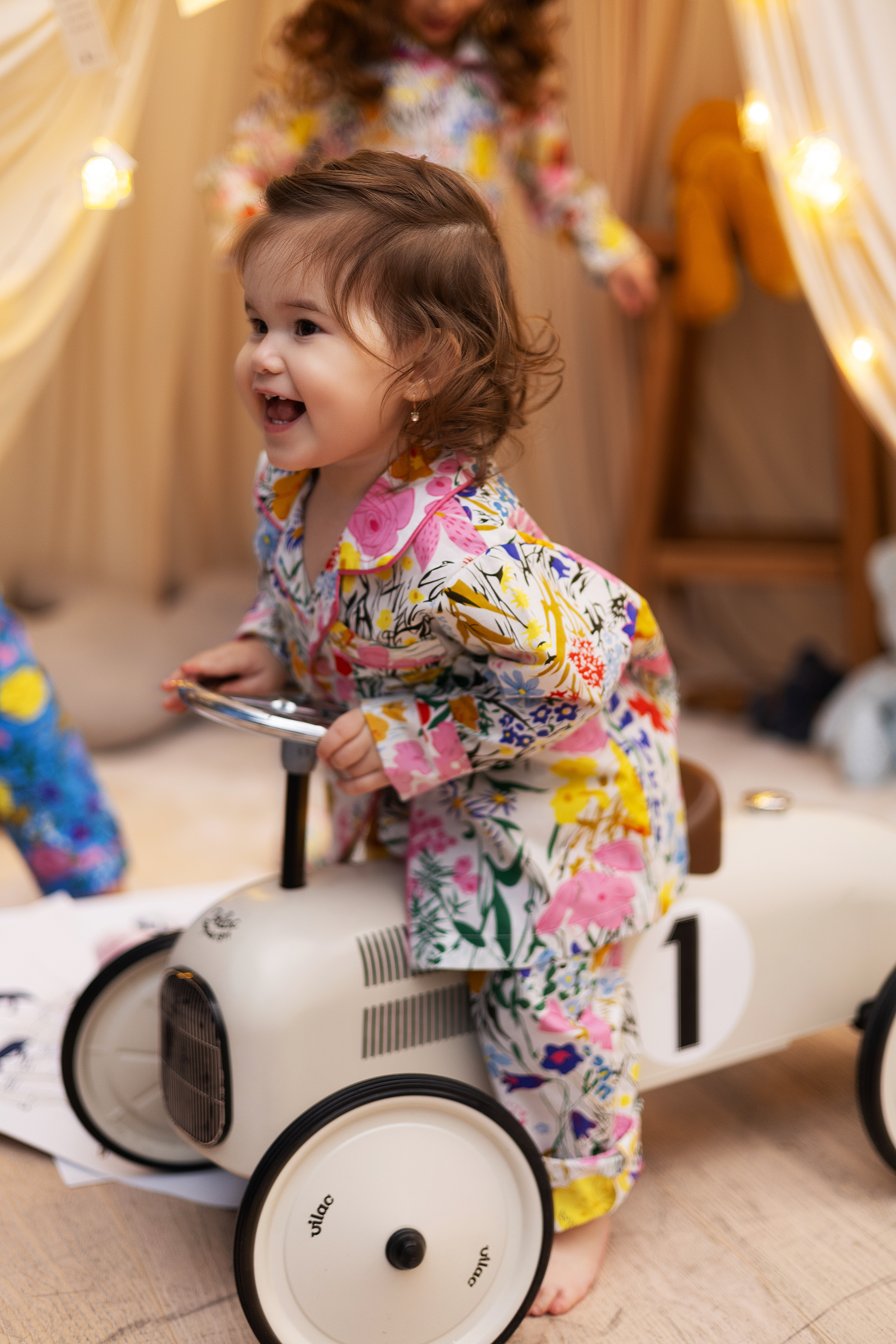 На чистом белом фоне расцвели разноцветные цветы как будто с детских рисунков. Пижама для комфортного времяпрепровождения дома и волшебных снов.