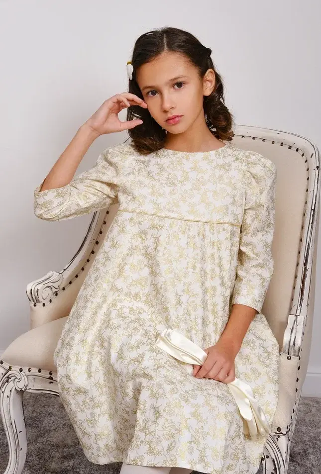 Юбка-колокольчик и воздушный объем у плеча создают гармоничный силуэт настоящей леди.