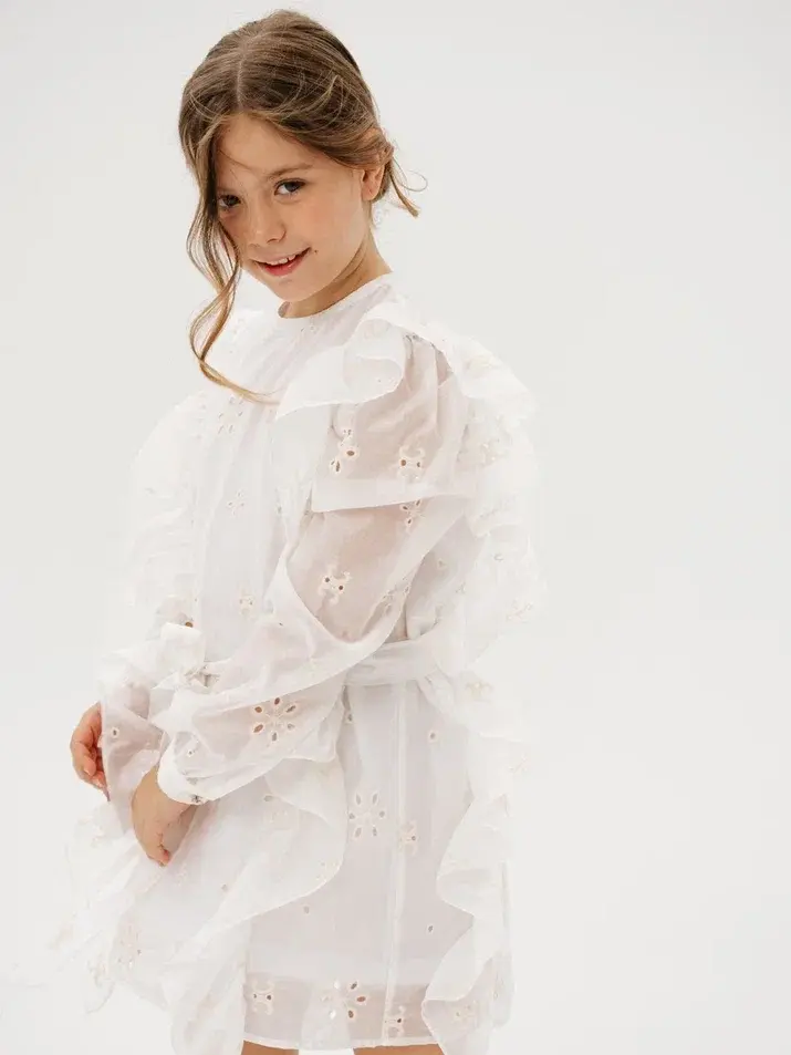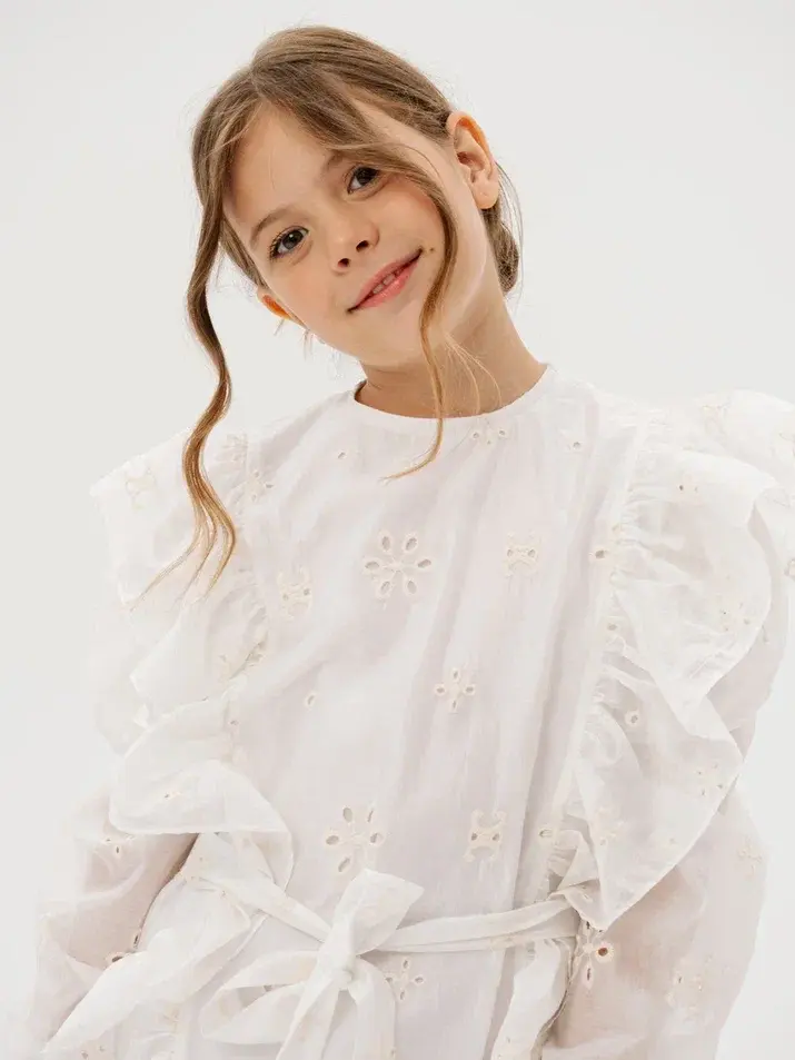 Невесомое летящее платье, выполненное из шитья, сделает образ девочки особенно нежным и нарядным.